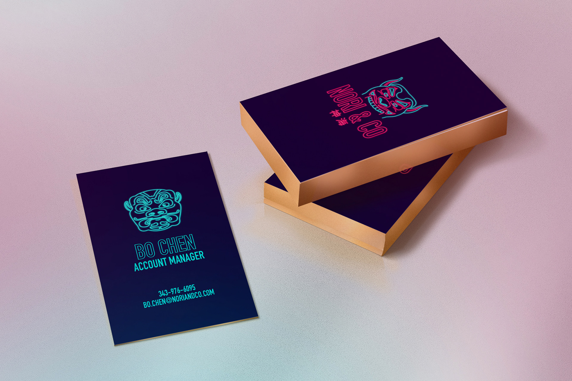 Création de 3 masques japonais pour une ambiance néon, déclinée sur cartes de visites.